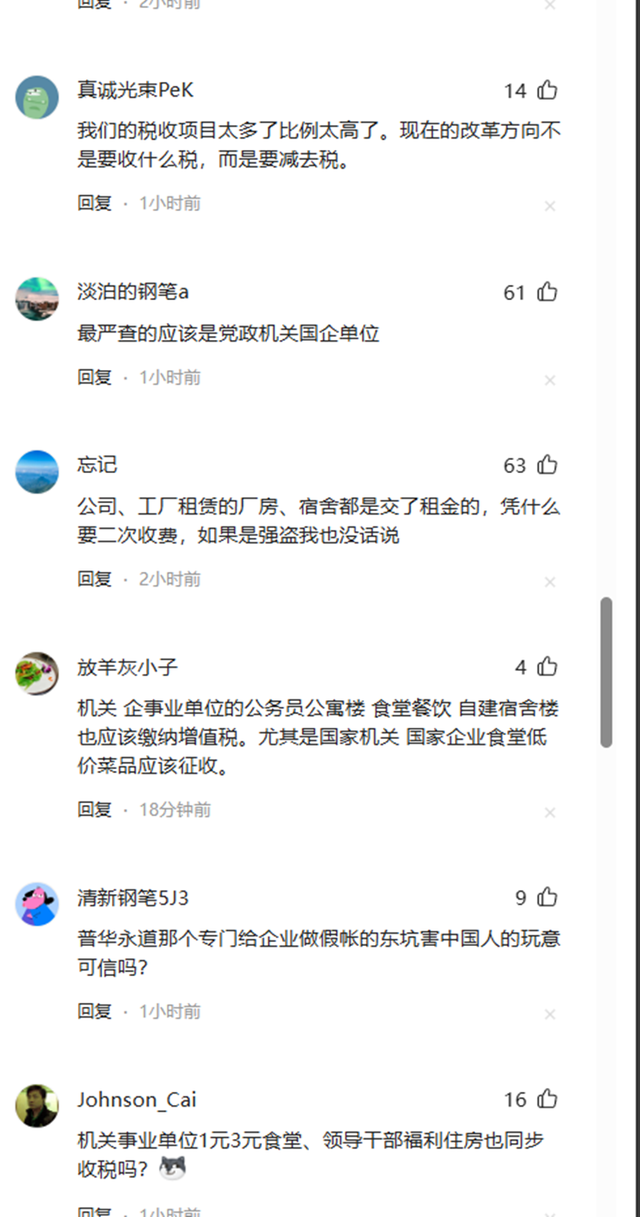 有企业从业者的叫苦不迭,知情人纷纷现身说法,食堂早承包给餐饮公司了,食材、人工、税费承包方都缴过,现在单位还要再缴6%增值税,纯属重复增负,中小企业根本扛不住。