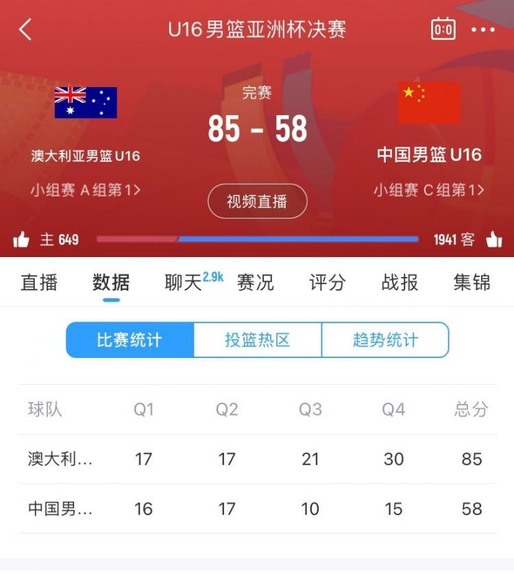 直播吧9月7日讯 U16男篮亚洲杯决赛,中国男篮U16以58-85的比分不敌澳大利亚男篮U16。