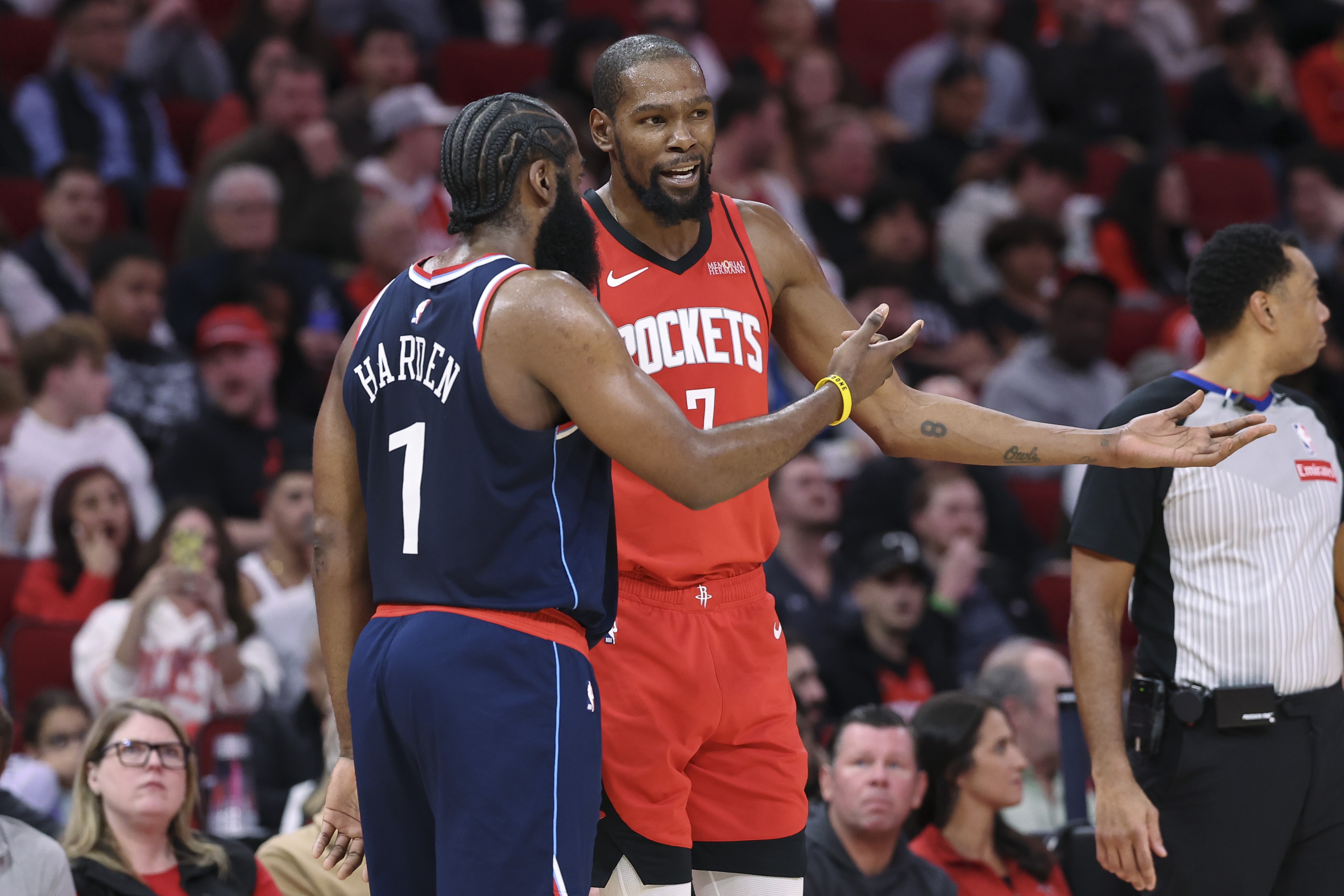 据统计,本赛季至今,杜兰特出战37场,场均出战36.5分钟,排名联盟第三;而哈登出战38场,场均出战35.7分钟,排名联盟第7。
