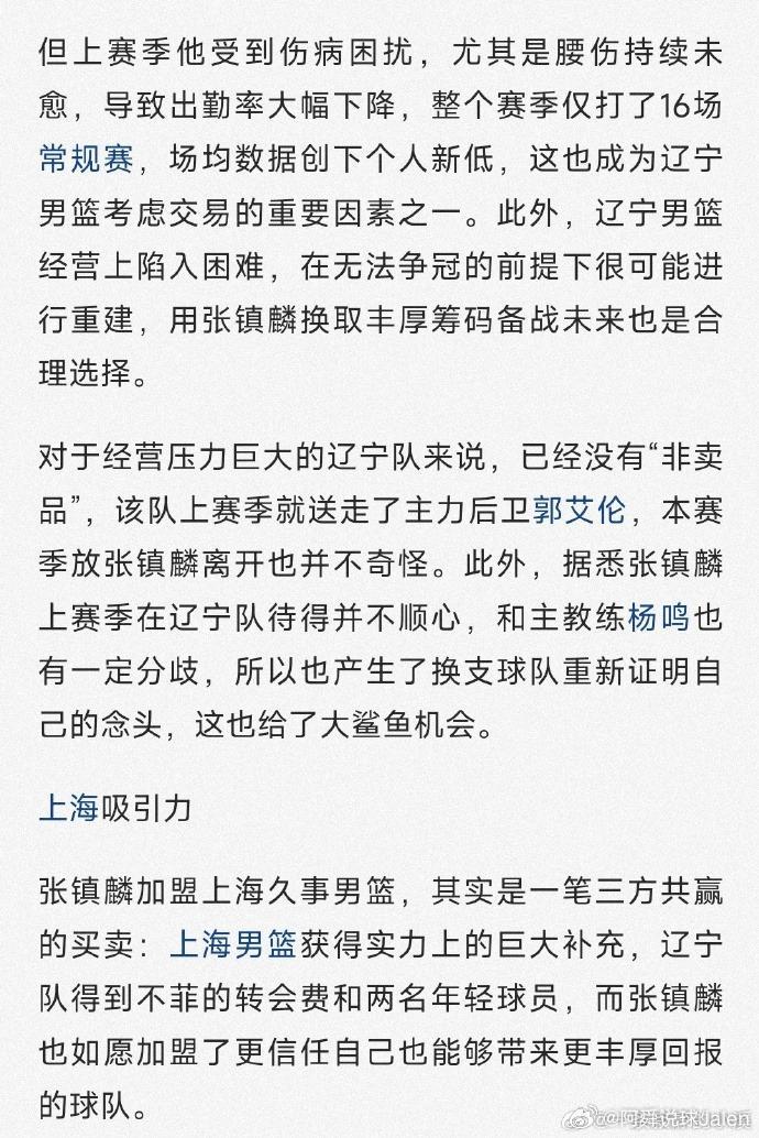 3、据悉,张镇麟上赛季在辽宁队待得并不顺心,和主教练杨鸣也有一定分歧,所以也产生了换支球队重新证明自己的念头,这也给了大鲨鱼机会。